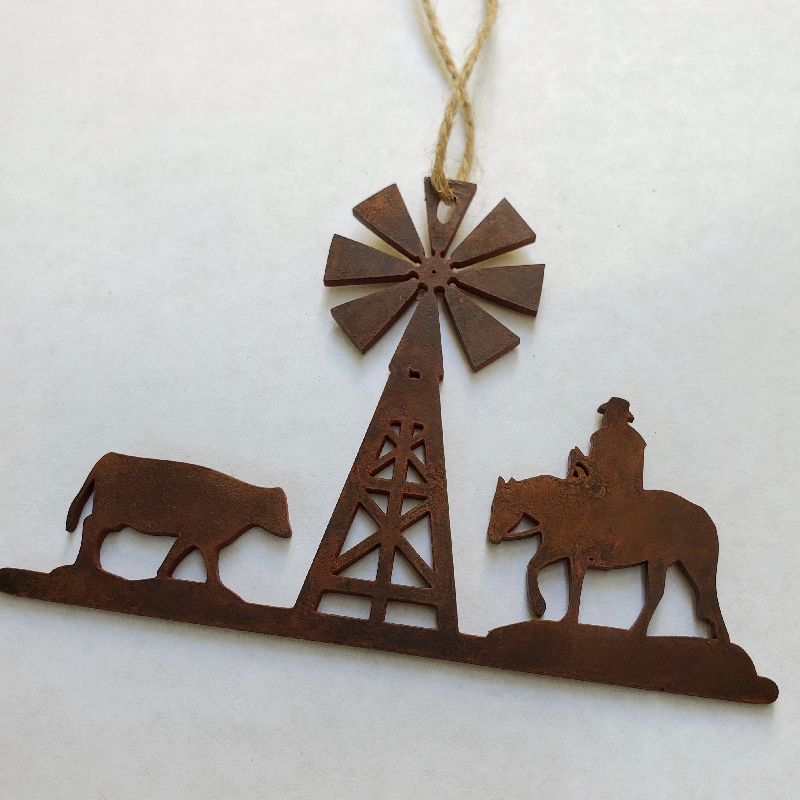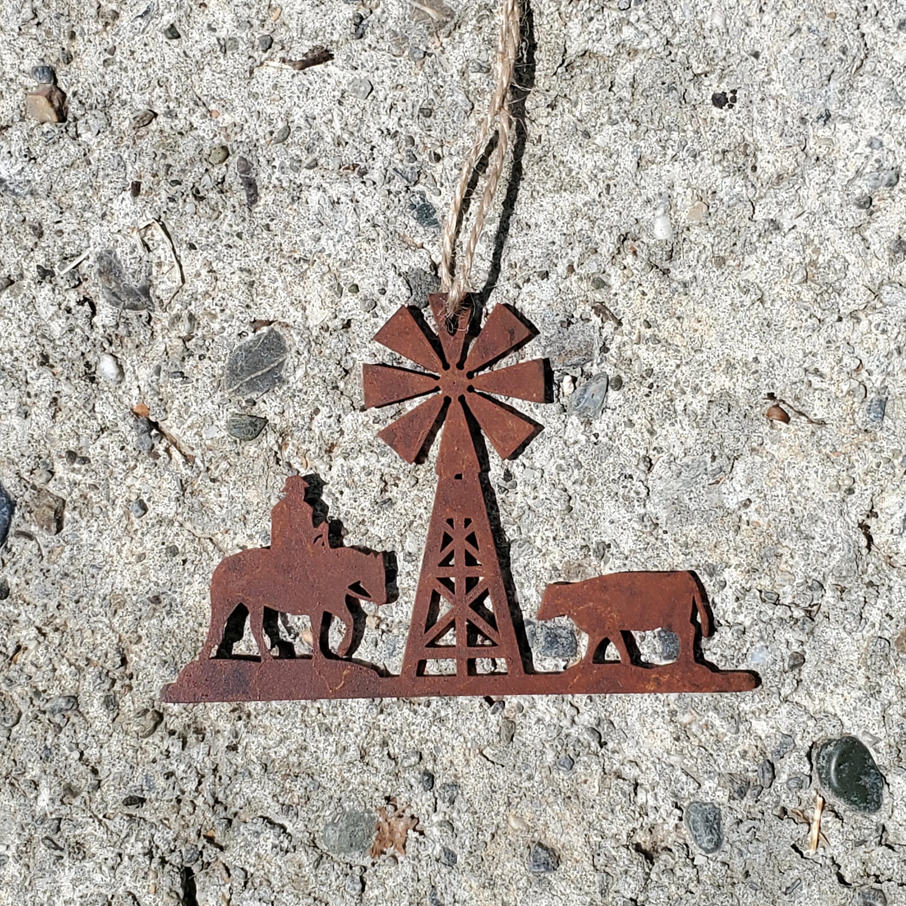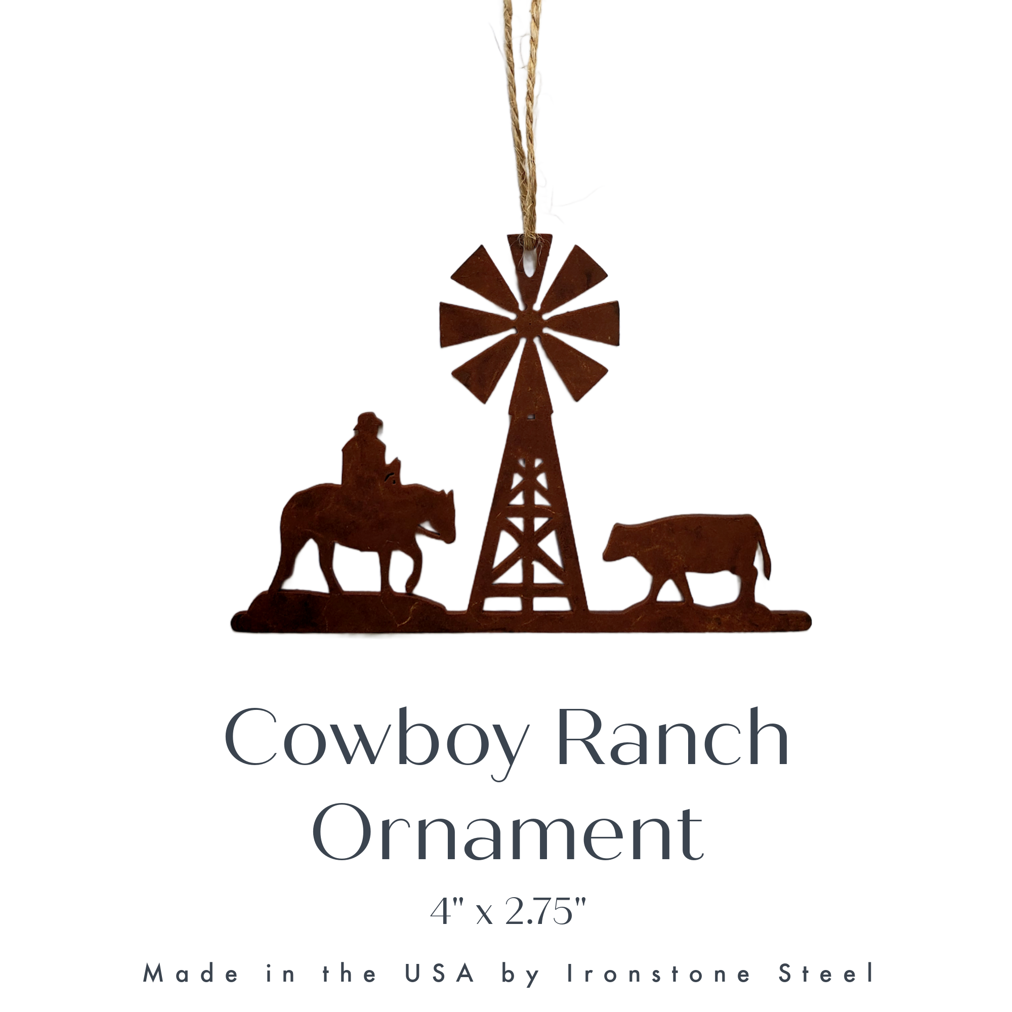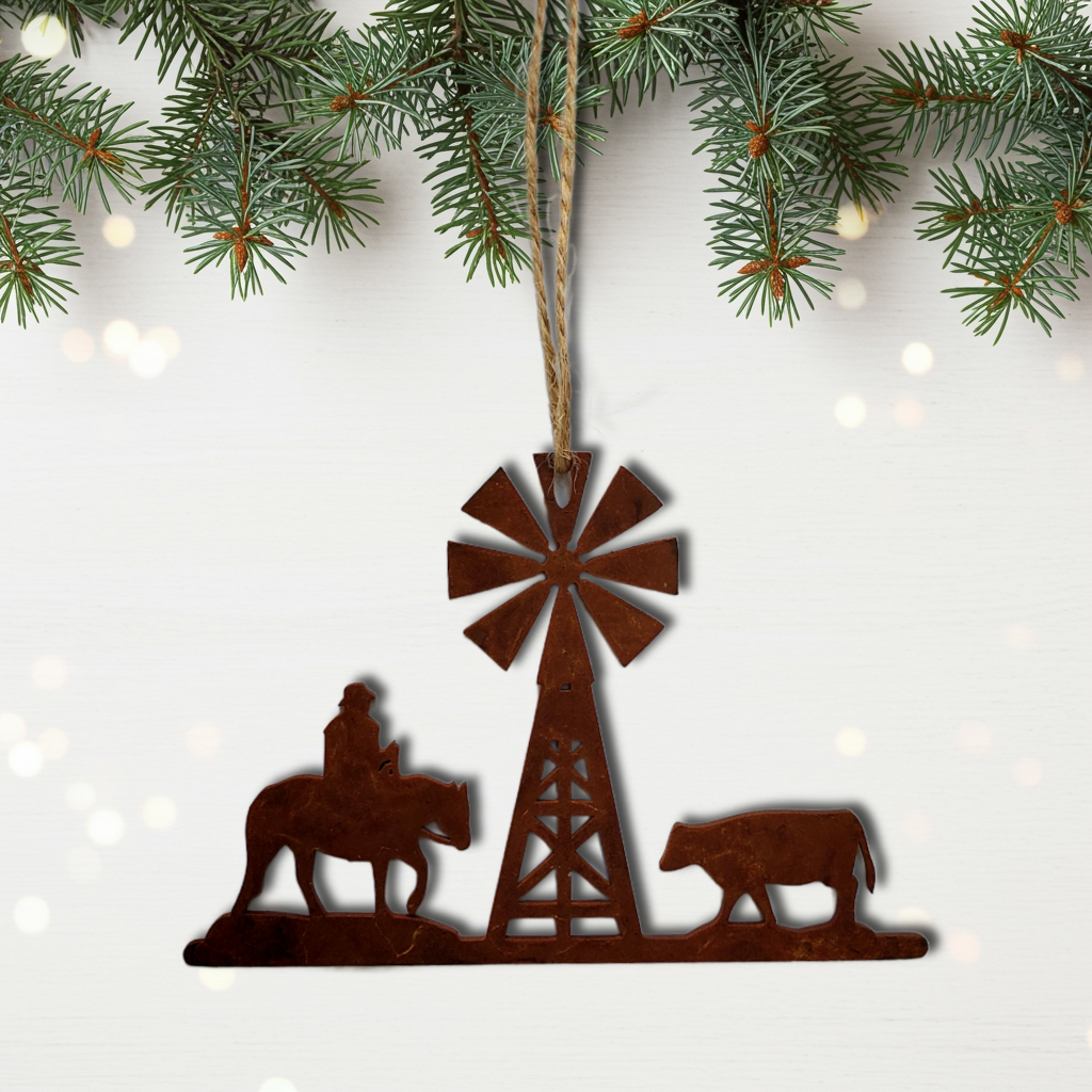 Bring the heart of the ranch to your holiday tree with this beautifully crafted Cowboy Ranch Christmas ornament. Featuring a cowboy on horseback, a cow, and a windmill, this ornament captures the essence of the Western lifestyle. Made from durable 14-gauge steel and finished with Ironstone Steel’s signature rusted patina, it boasts rich, rustic tones and a timeless, weathered appearance perfect for adding charm to any holiday display.