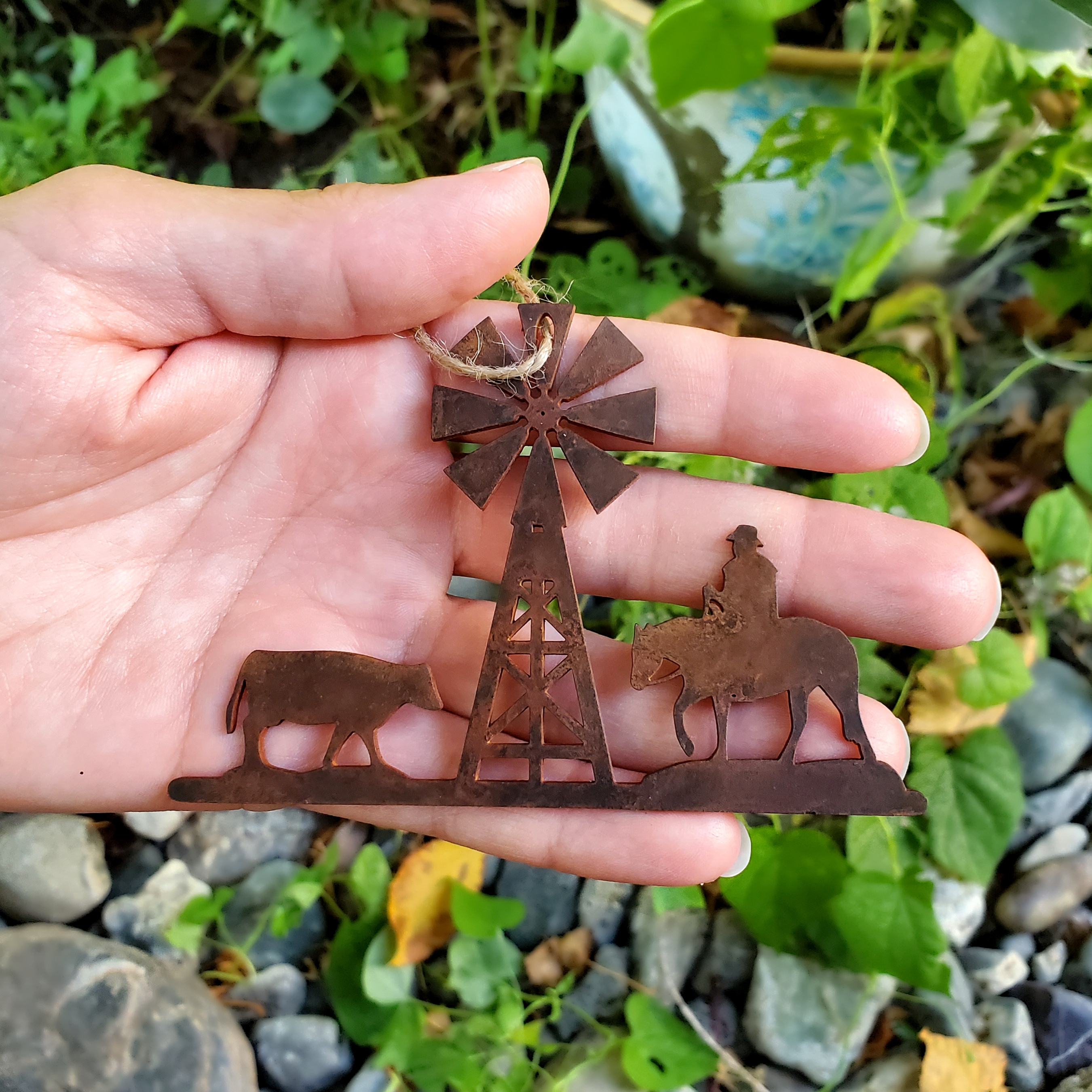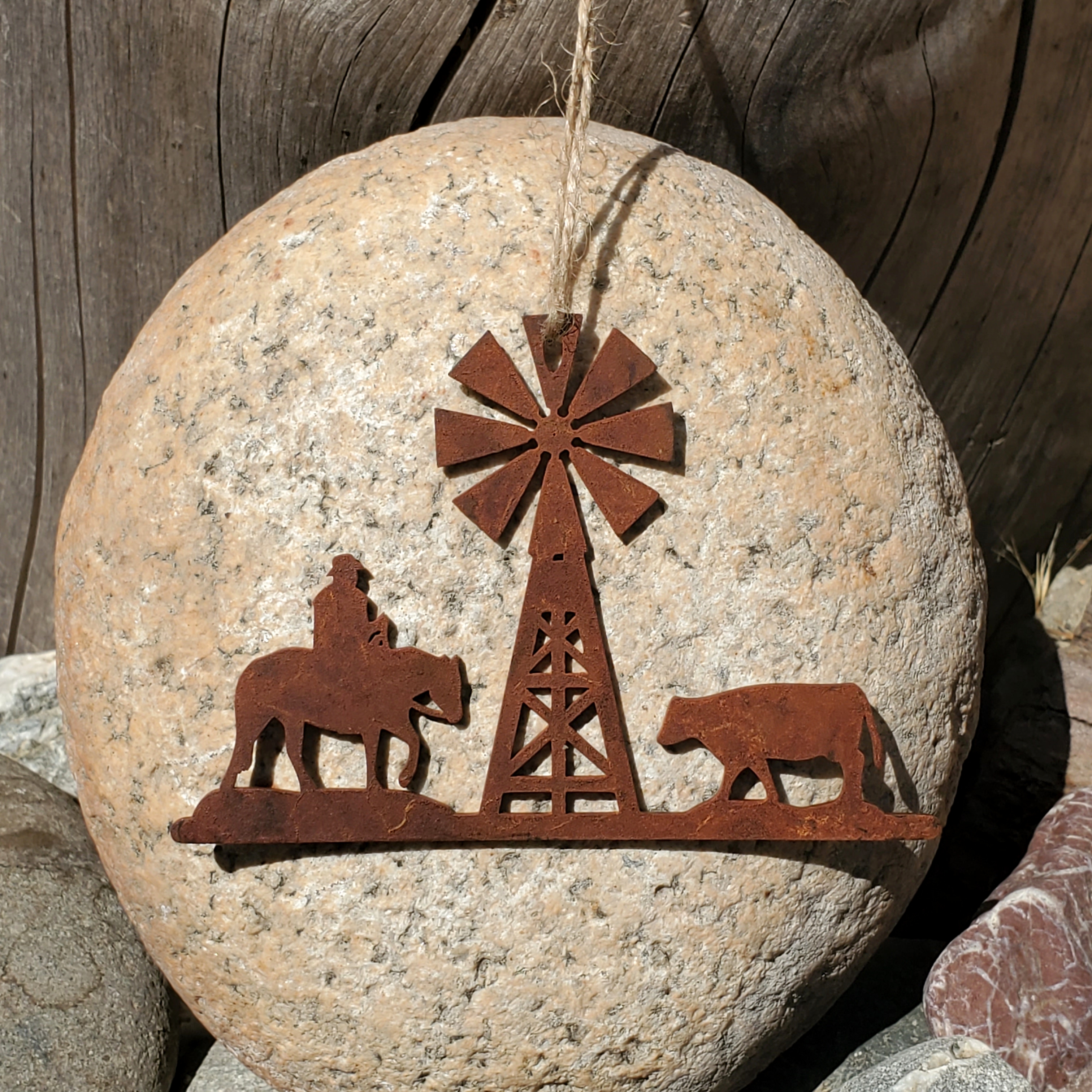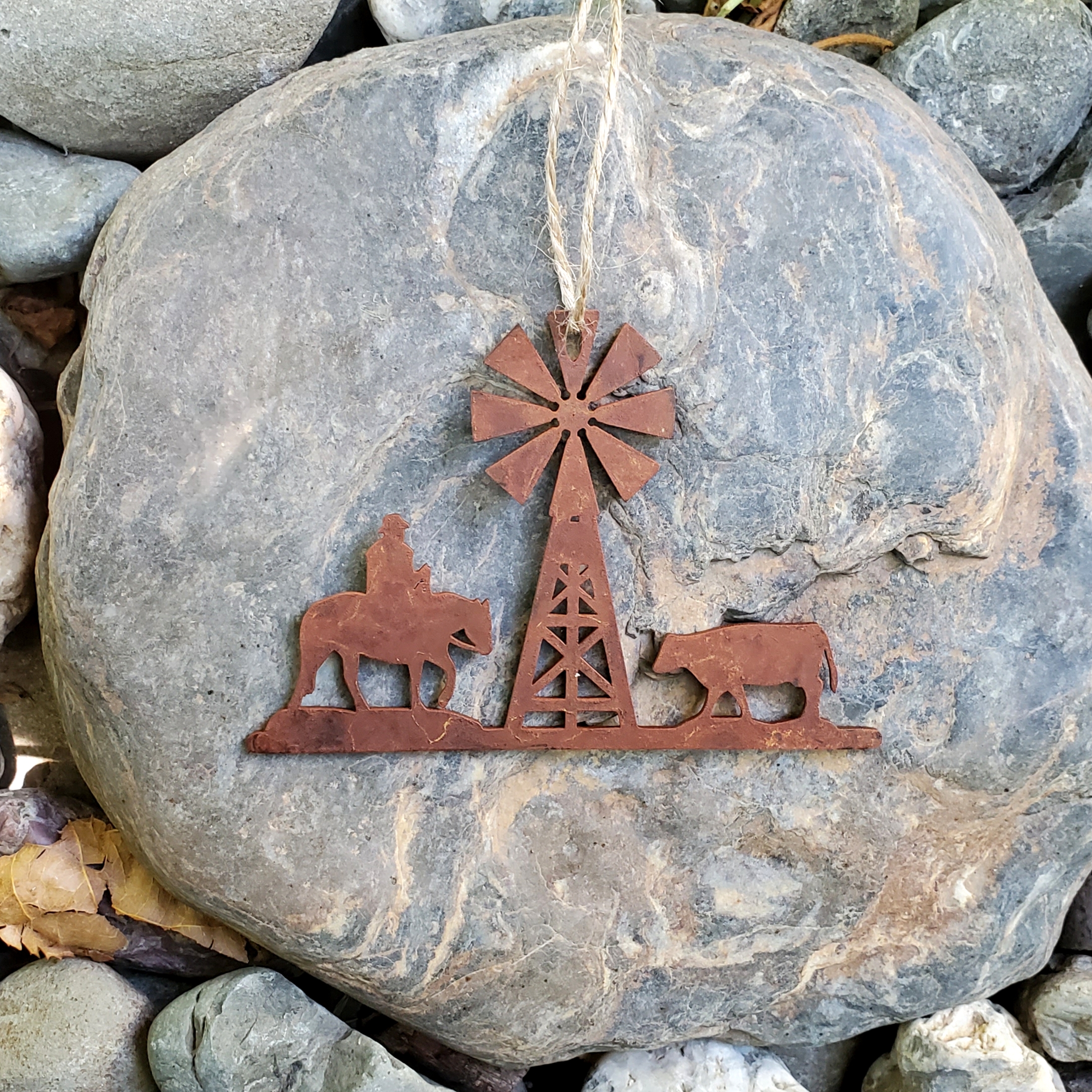 Bring the heart of the ranch to your holiday tree with this beautifully crafted Cowboy Ranch Christmas ornament. Featuring a cowboy on horseback, a cow, and a windmill, this ornament captures the essence of the Western lifestyle. Made from durable 14-gauge steel and finished with Ironstone Steel’s signature rusted patina, it boasts rich, rustic tones and a timeless, weathered appearance perfect for adding charm to any holiday display.